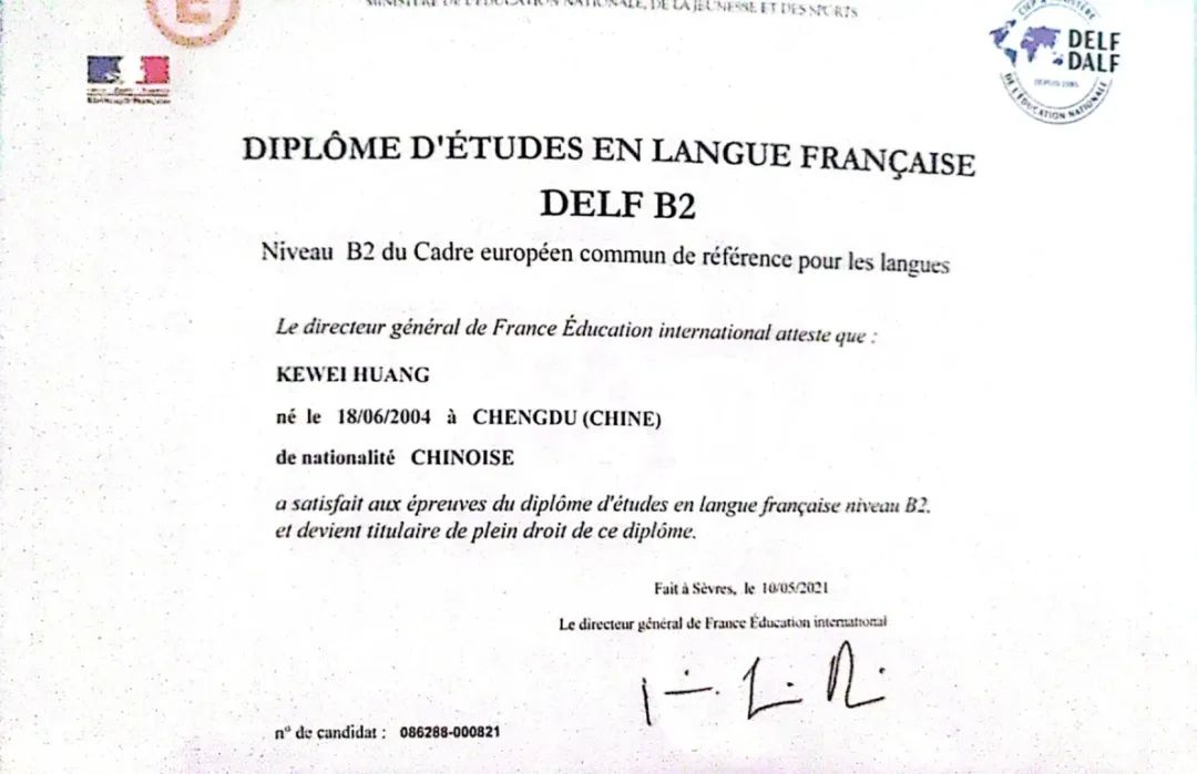 黄可为,成都外国语学校高2022届法语班毕业生,高二下DELF考试中获得DELF B2法语终身文凭。2022年,该同学通过保送考试同时被浙江大学,南京大学录取,最终选择浙江大学法语系。