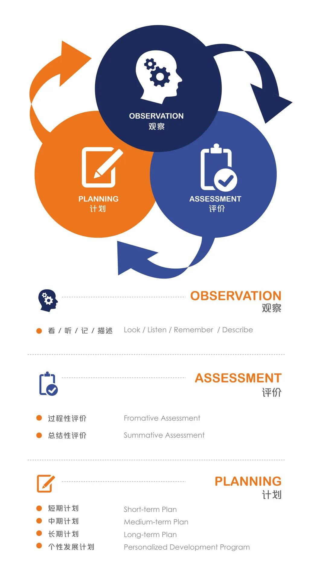根据EYFS早期教育体系中的七大学习与发展领域、三大有效学习特征,遵循“独一无二的儿童”这一原则,使用OAP循环圈以追踪孩子的学习发展情况。