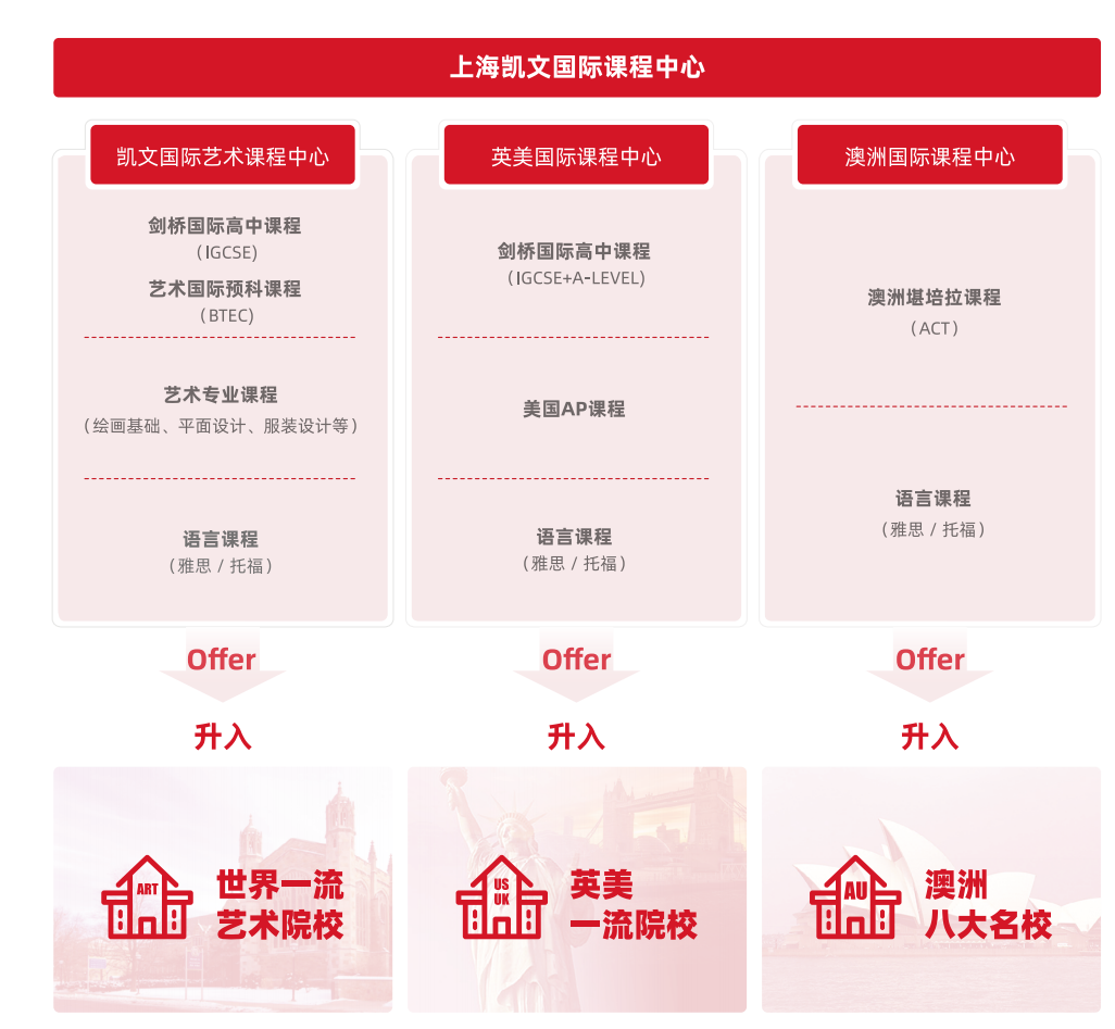 在课程设置上,上海凯文以中国国家课程为基础,特有的国际高中攀登课程(CLIMB)为核心,融合凯文教育集团、美国玛瑞丹私立高中和澳洲堪培拉教育系统等多元化优质办学资源,系统性地开设了凯文国际艺术课程中心、英美国际课程中心、澳洲国际课程中心三大课程中心,为学生提供多元化的升学路径。