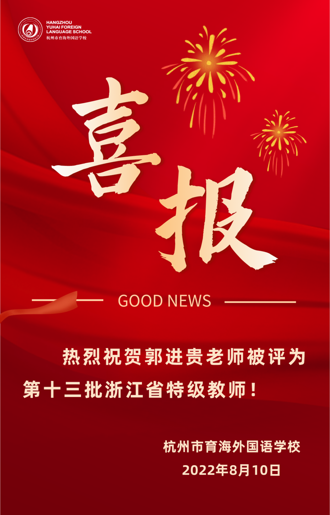 近日,第十三批浙江省特级教师评选结果揭晓,我校郭进贵老师榜上有名,荣获“浙江省特级教师”荣誉称号。这是我校建校五年来培养的首位特级教师,向郭进贵老师表示热烈的祝贺!