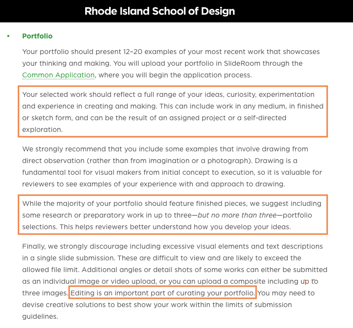 要想弄明白什么是大学申请作品集,就要先反推了解顶尖艺术大学在寻找什么样的学生。以美国罗德岛设计学院的作品集要求为例,他们所期望的作品集需包含以下几个要点: