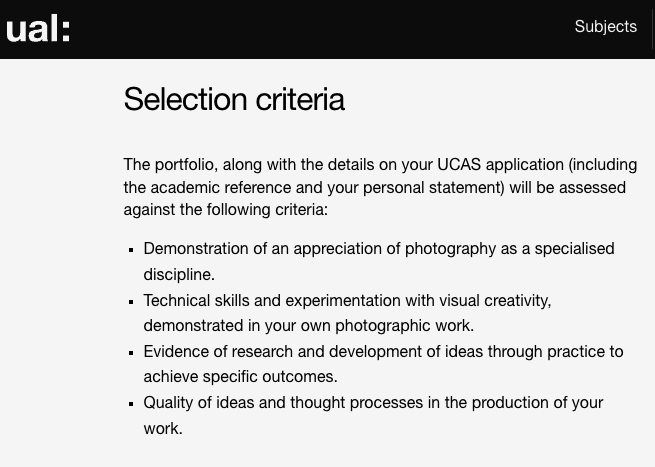 我们再来看,如果学生申请英国伦敦艺术大学本科摄影专业,那么所递交的作品集要点是: