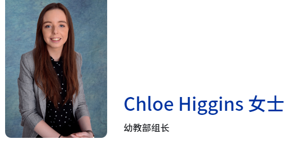 Chloe Higgins老师毕业于诺森比亚大学小学教育专业(荣誉学位),其后在英格兰北部的学校开展教学生涯。她曾在英国执教KS2阶段两年,然后移居至卡塔尔任教。Higgins老师曾担任多个领导职位,包括K4小组组长,负责幼教部评估,以及整个幼教和小学阶段的阅读和自然拼读工作。在此期间,她获得高级管理者职业资格证书。Higgins老师于2021年加入重庆耀中,担任幼教部组长及K3阶段老师。她热衷于为孩子们提供一个有利的学习环境,提倡共同学习和探索多元化的学习机会。她认为孩子们应该有更多玩耍的机会,以遵循和发展自己的兴趣。