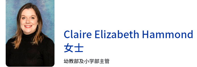 Claire Hammond老师2011年毕业于罗汉普顿大学,小学教育专业。她在伦敦附近的一所小学开始教学生涯,任K4老师四年,教授一年级三年,同时担任各个领导职位。Hammond老师之后加入重庆耀中任三年级组长,继而成为二年级学习共同体组长及P4C班主任。2020年,她晋升幼教部及小学部执行主管。她的教学宗旨是无论做何事都把学生放在中心,确保他们能充分发展潜能。她相信重庆耀中的学生能够有美满的学习旅程,这里每一位员工都是关键成员。