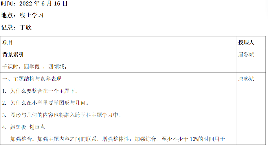 丁欣:通过本次学习,更全面地了解了图形与几何领域的主要变化,其中图形与几何的内容也将融入跨学科主题学习中,教学中要加强主题内容之间的联系,增强整体性,加强综合性。