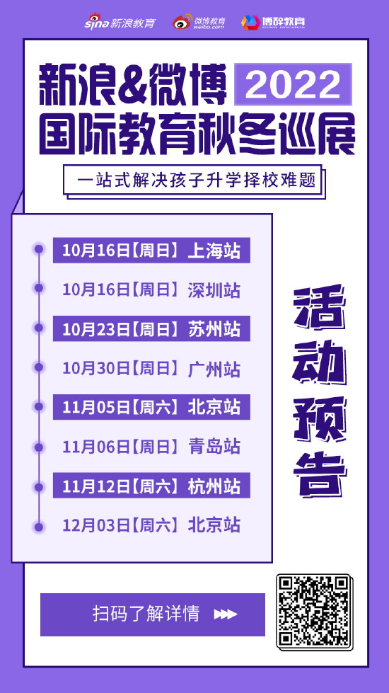为了帮助深圳家庭了解国际化学校的办学特色,为孩子选择到合适的校园,10月16日(周日),由新浪教育、微博教育、博辞教育联合举办的“新浪&微博2022国际教育秋冬巡展”将在深圳凯宾斯基酒店三层举办。