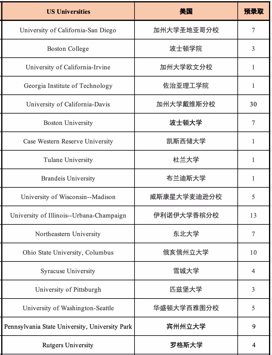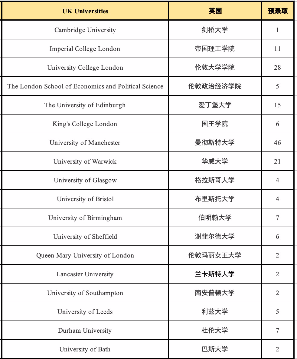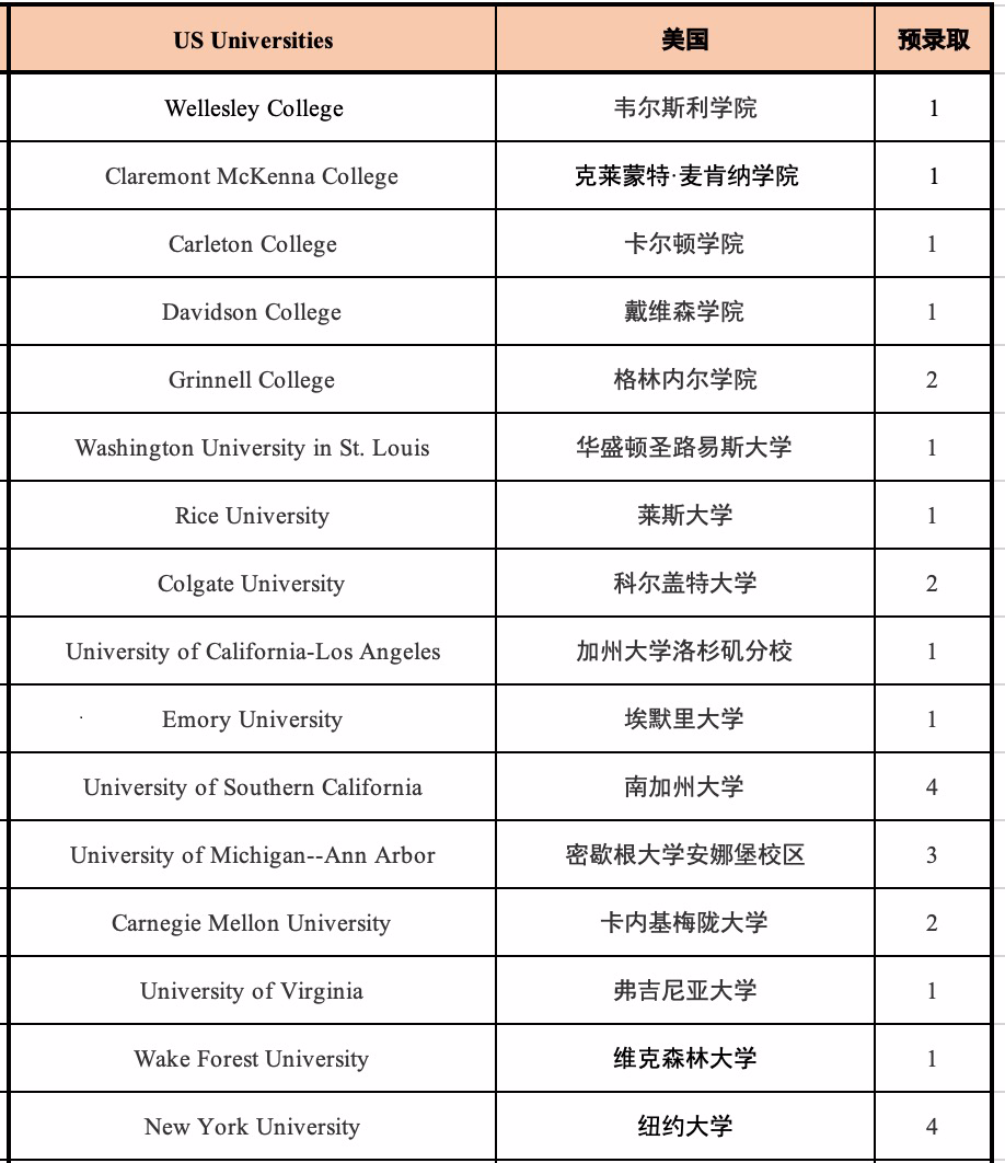 学生出口:2022届毕业生93%申请英国方向的学生进入QS英国排名前5大学,93%申请英国方向的学生进入QS世界前16大学,100%进入罗素大学集团,100%学生进入QS世界前100大学加拿大、中国香港,排名第一的大学均抛来橄榄枝。美国方向收获了如:加州大学圣巴巴拉分校、波士顿大学;文理学院包括,赵小兰母校——美国最古老的女子学院曼荷莲学院,以及著名的七姐妹学院之一布林莫尔学院。英国方向包括伦敦大学学院、爱丁堡大学、杜伦大学、伦敦大学金士顿学院等
