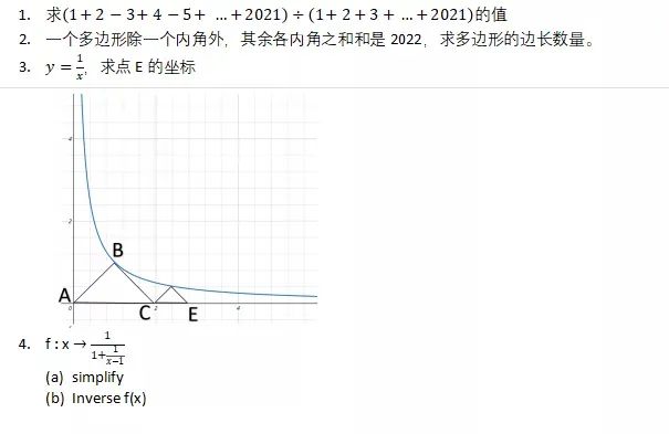 考察内容:代数的加减计算,化简,概率,几何坐标,反函数,图形题(求多边形有几条边)