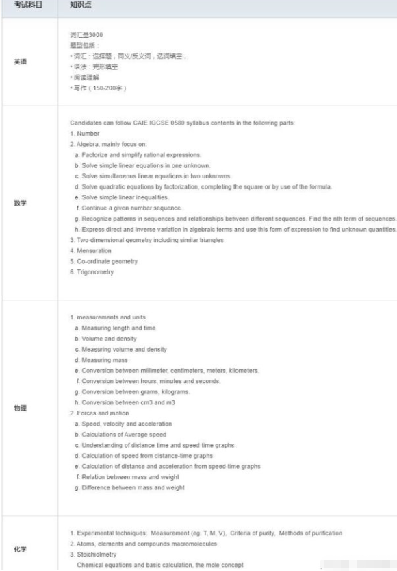 领科教育上海校区是为有出国留学愿望的中学生提供国际教育服务的全日制教育机构,是英国剑桥大学国际考试委员会(CIE)在中国上海市的直接授权单位。其目标是为世界一流大学输送优秀学生。领科教育上海校区秋季班招生对象有初三毕业生、高一、高二学生,不同年级的学生入学考试的科目都不同,所以为了让学生们清楚自己所需要准备的科目考试,我们将每个年级入学考试要考的科目都列举了出来,供参考。