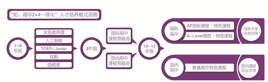 让学生无升学之忧,体制内外双轨道升学保障。学生在初三可以自主选择直升校内国际高中课程预备班或国内高中课程预备班。
