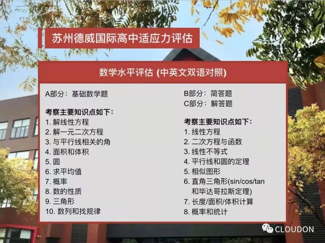 数学评估全程可使用科学函数计算器,请学生自备。参加评估当天,学生可能会被邀请到德威做进一步评估。