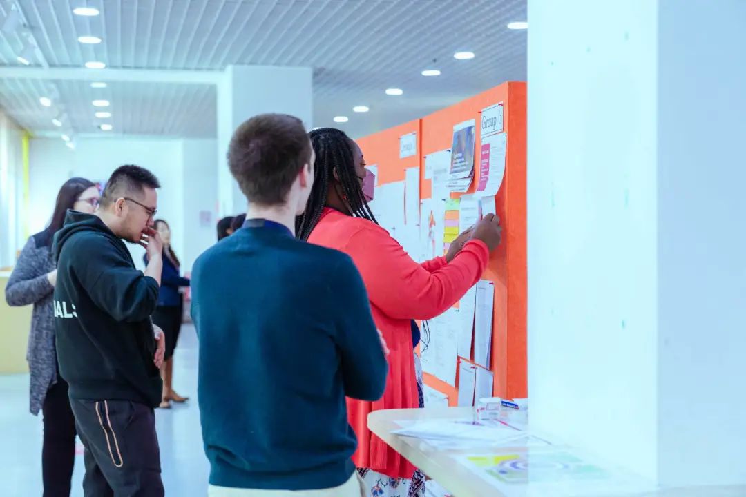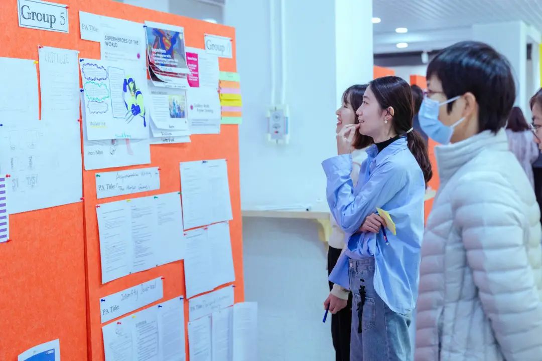「PA 展」吸引了不少老师驻足观看 与以往教研培训不同的是,这次的除了传统培训和工作坊之外,还会配合一场「PA 展」。我们会共同定义「引以为傲」的 PA 任务和作品有哪些特点, 也会交流教师们设计了怎样的 PA 任务以支持学习者产出这样的作品。每位教师会带着自己的作品参与小组讨论,小组讨论后共同布展,预计会从 20 多项 PA 中投票选出 4 个最受欢迎的 PA 任务及学生作品。 教师们按照学科分为几个小组,相互分享了自己之前所设计的课程项目案例。他们需要观察和讨论这些案例中,考察了学生的哪些具体技能,中间设计的哪些脚手架和小任务为学生完成整个项目提供了支持,在完成一个高质量作品的过程中,学生体会了怎样的学习进程。