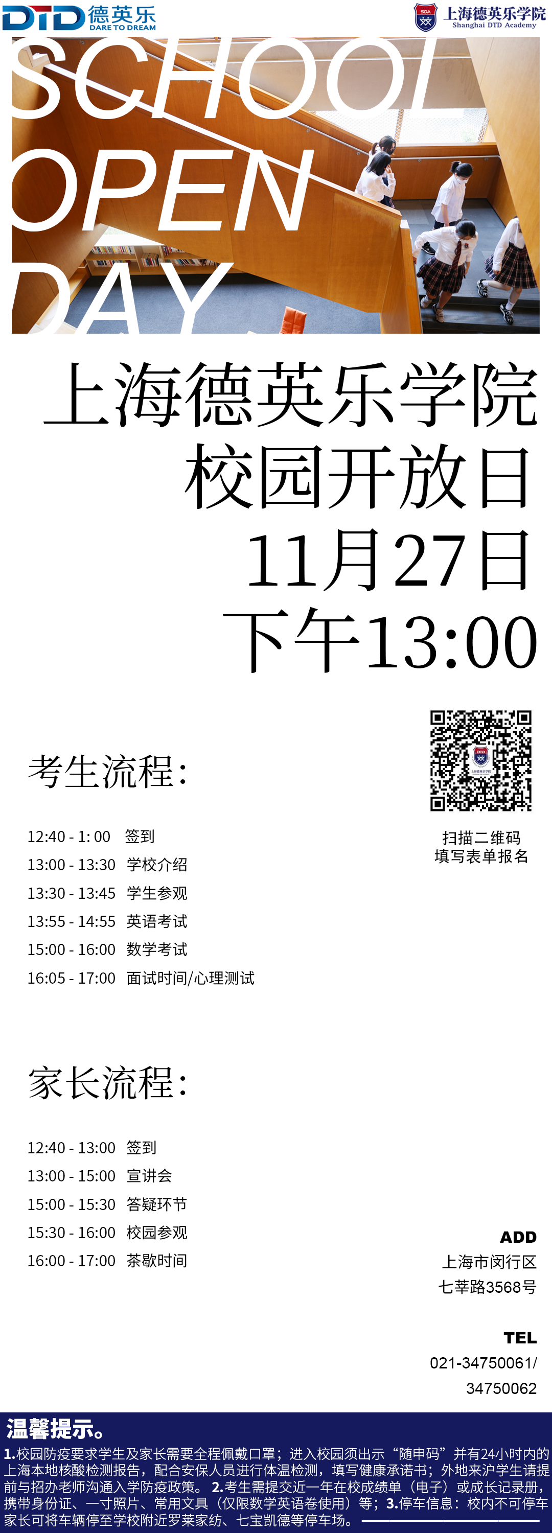 上海德英乐学院,2023年春招第二场正式开放预约。小德真挚地邀请您和孩子,于11月27日参加校园开放日,共赴理想。具体信息流程,详见海报内容。