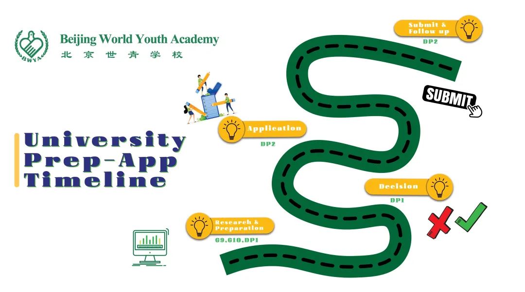 根据不同年级学生的需求,大学升学指导老师们会针对性地安排不同的交流活动。帮助学生和家庭提前了解,有的放矢地根据学校和专业的要求做好充足的准备。从9、10年级开始了解,到进入DP阶段时选择适当的课程,指导老师们制定了一系列的信息分享活动,帮助他们一步步朝着梦想前行。
