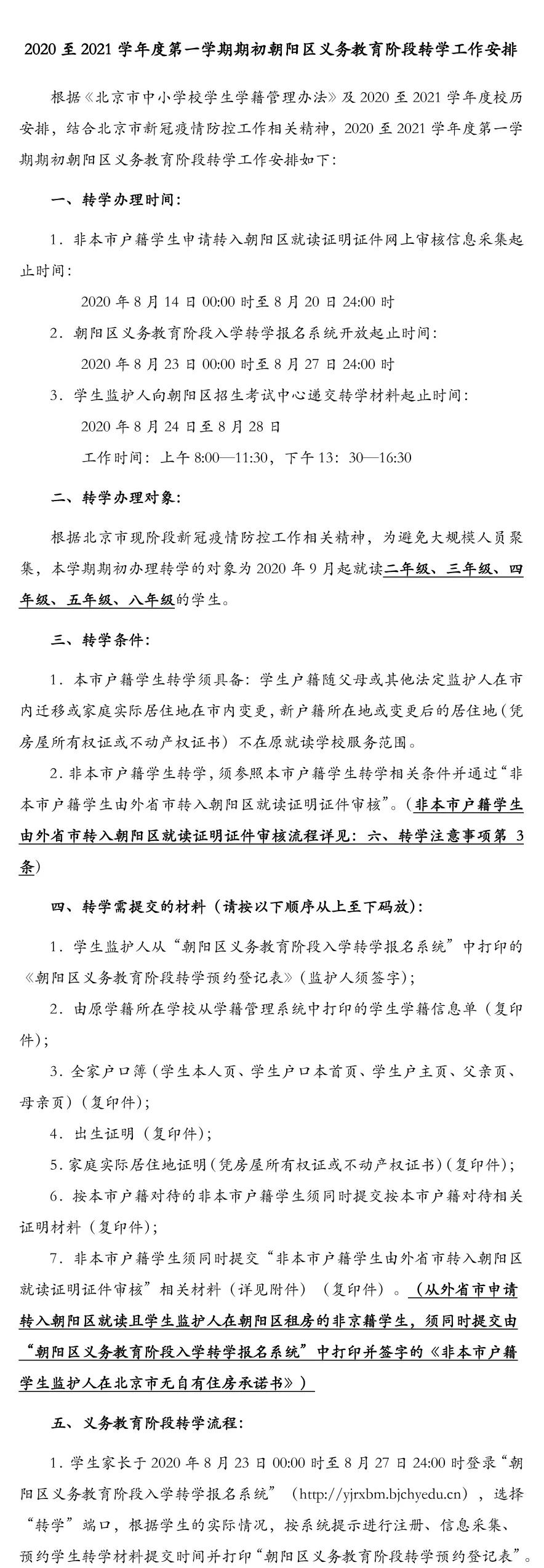 (一) 由于各方面情况的调整与变化,本网所提供的【北京朝阳区义务教育阶段转学工作的安排】仅供参考,并不意味赞同其观点或证实其内容的真实性,相关信息敬请以权威部门公布的信息为准。