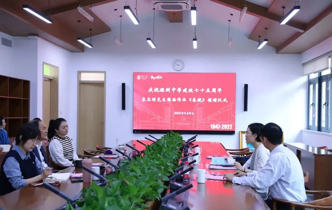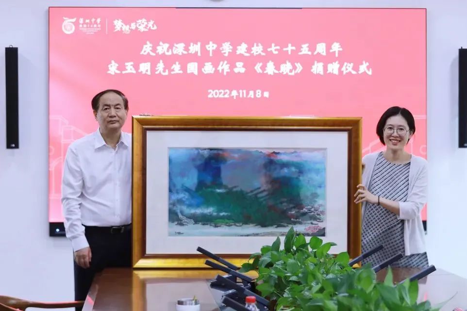 11月8日上午,寒意袭人,但一份珍贵的礼物,却让所有深中人的心都暖了起来——深圳中学2000届校友宋珮回访母校,并将一幅由他父亲、著名画家宋玉明先生创作于2022年的泼彩山水画《春晓》赠予母校,作为献礼学校建校75周年的礼物。