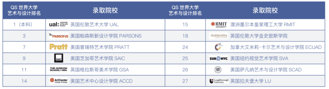 省实IFPAD的教学质量获得各国艺术名校的高度认可,毕业生遍布QS世界大学艺术设计类排名前30名的艺术院校(本科直录),包括: