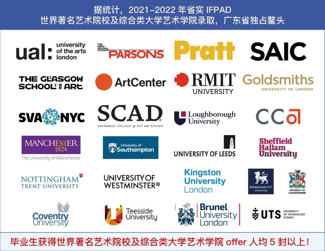 省实IFPAD历届毕业生获得世界著名艺术院校及综合类大学艺术学院的录取通知书人均5封以上。2022届毕业生获得英国伦敦艺术大学UAL(简称“伦艺”,QS世界大学艺术设计类本科排名第1,素有艺术界的哈佛、牛剑之称)的录取函高达14封,省实IFPAD也因此被家长和同学们赞誉为“伦敦艺术大学的摇篮”。