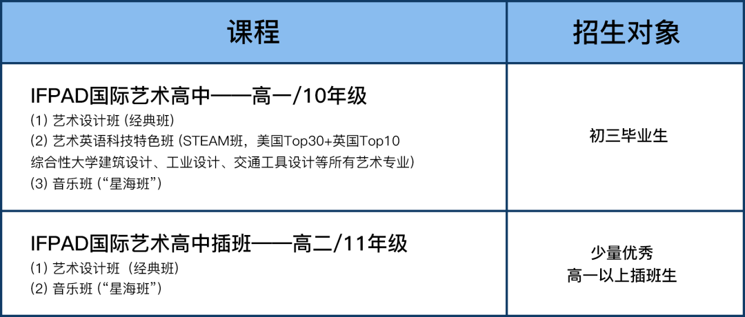省实IFPAD招收初三及以上学历学生,提供设计、美术、音乐、传媒等方向课程,包括平面设计、服装设计、动画设计、流行演唱、音乐管理等超80个专业,通过语言、文化、创意思维、批判性思维、沟通能力、合作能力、领导能力等全方位的培养,帮助学生成功进入英国、美国、加拿大、荷兰、意大利、澳大利亚、新加坡和日本等国家的一流艺术院校和综合类大学艺术学院学习,助力学生取得留学和未来事业发展的成功。