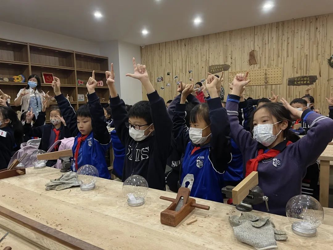 在木艺展厅里,同学们了解木文化的相关知识,观看了传统木制品的制作加工工艺流程,并现场观摩了现代木工匠人、瓷器匠人的制作流程。最后,大家跃跃欲试,来到了手工制作室,亲自动手用传统的刨子小心翼翼地刨木头屑,制作花灯。当稚嫩的眉宇间绽放出沉静专注的花朵,中国的“匠人精神”也悄无声息地流淌在每一位孩子们心间了!
