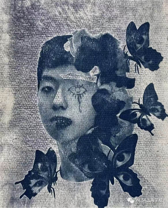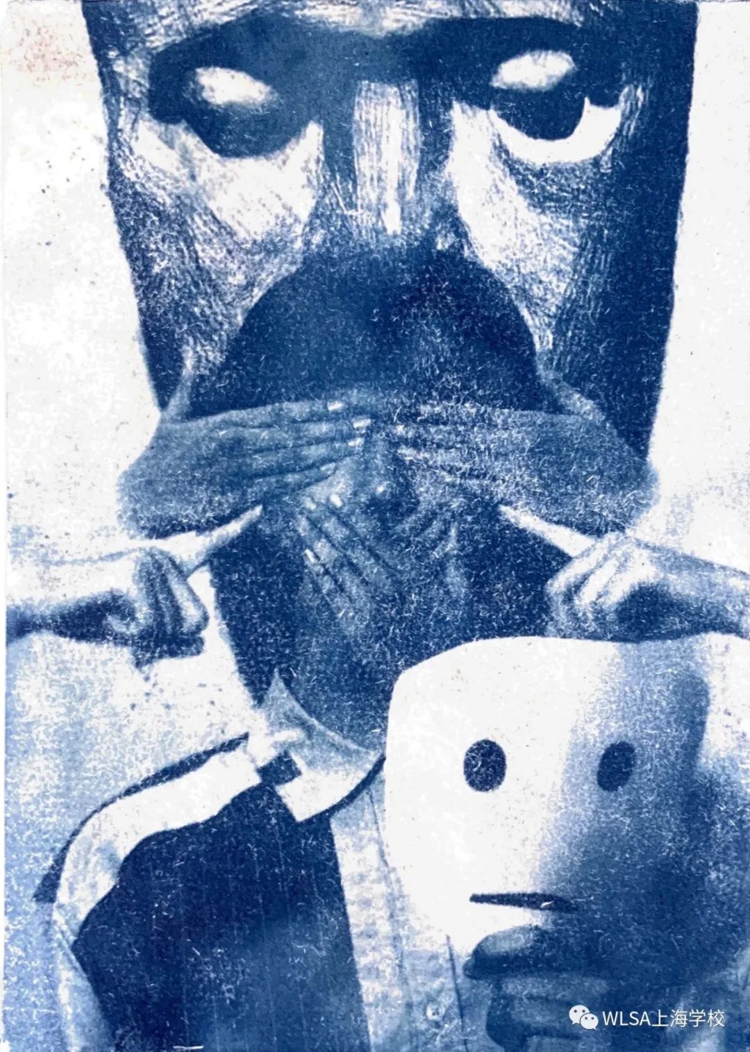 G12的艺术生们在学习了超现实主义的表达方法之后,将他们对社会的观察和思考,或者自己的经历和感受融入到作品中,用古法蓝晒独特的古朴神秘,创作出一幅幅有趣的作品。下面我们一起来看看他们的作品吧: