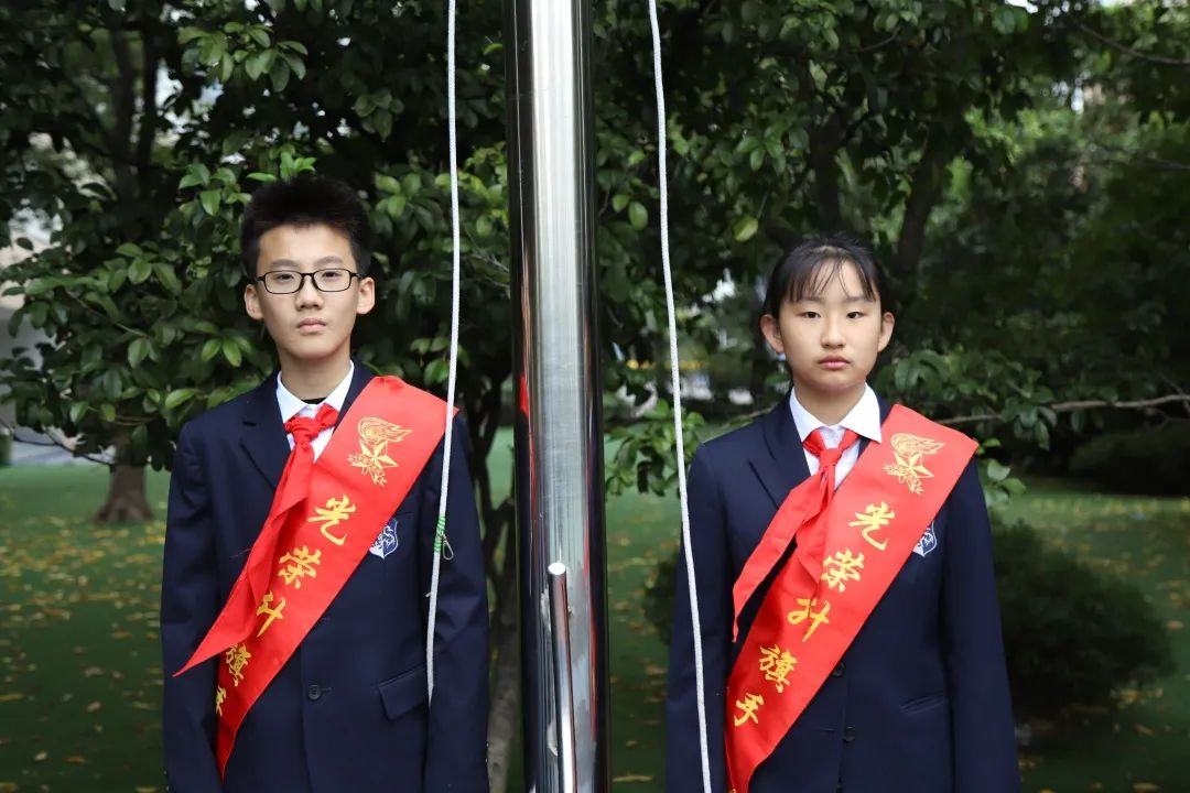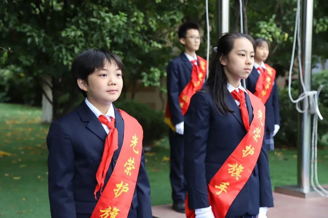 本学期第一次三部联合升旗仪式由双语部四(2)班的洪思为和融合部4E班的周悦哲同学主持。5D班的黎兆奕同学和5E班的李睿琪担任光荣的升旗手,七2班的何岩朔和陈奕凡同学担任光荣的护旗手。