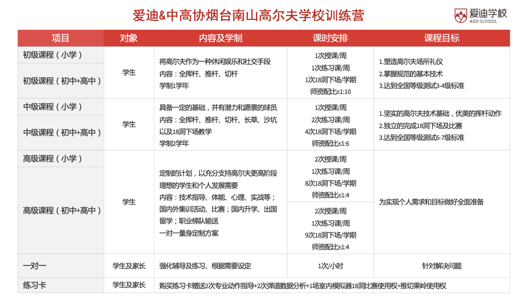 目前该课程从幼儿园到高中均有开设课程按照体育课、高尔夫兴趣班/专项训练营、校内赛、运动队的模式进行教授。