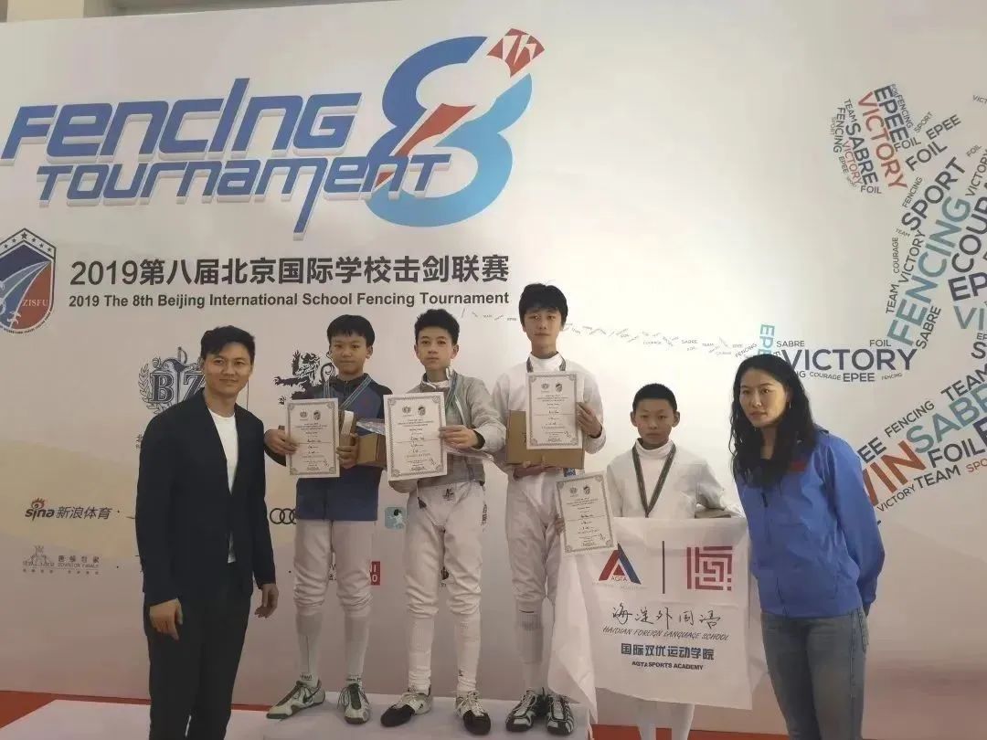 图| 田徽(右三)在第七届国际学校击剑联赛中获得男佩U14个人第三名并与世界男佩冠军仲满及著名运动员击剑钱佳睿合影