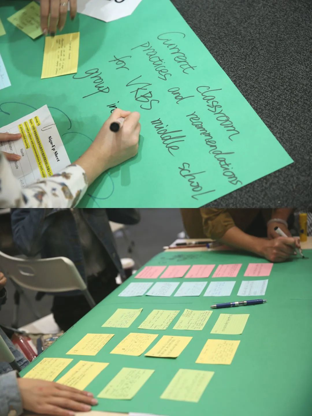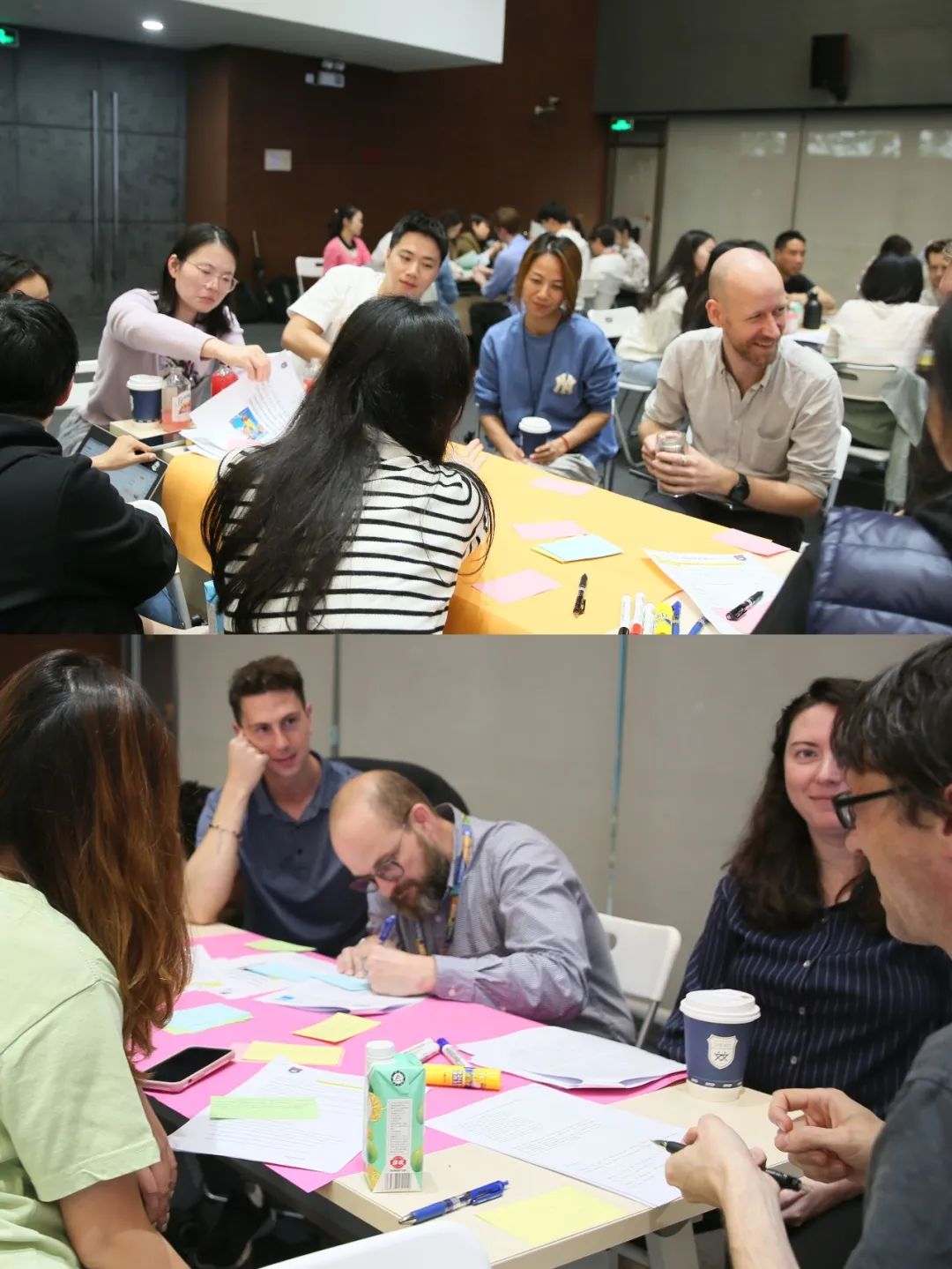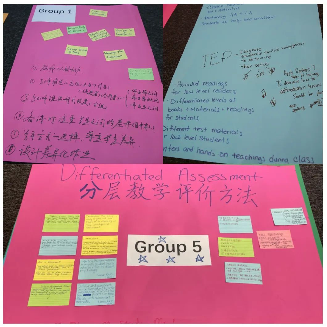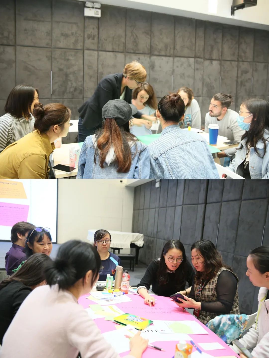 随后,各小组依据各自的议题,借鉴学习资料,结合自身经验,展开热烈的讨论。老师们有的在卡片上写满了对小组议题的思考内容,有的在组内轮流发表自己对议题的理解,有的快速完成了海报设计。