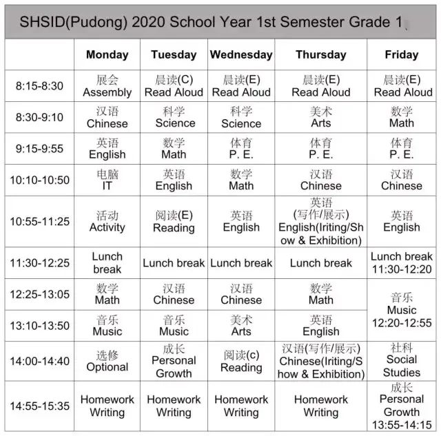 比如,下面是上中国际一年级的课程表,一节课40分钟,每天英语、数学、语文都有,体育、音乐、美术交错,看起来十分均衡。