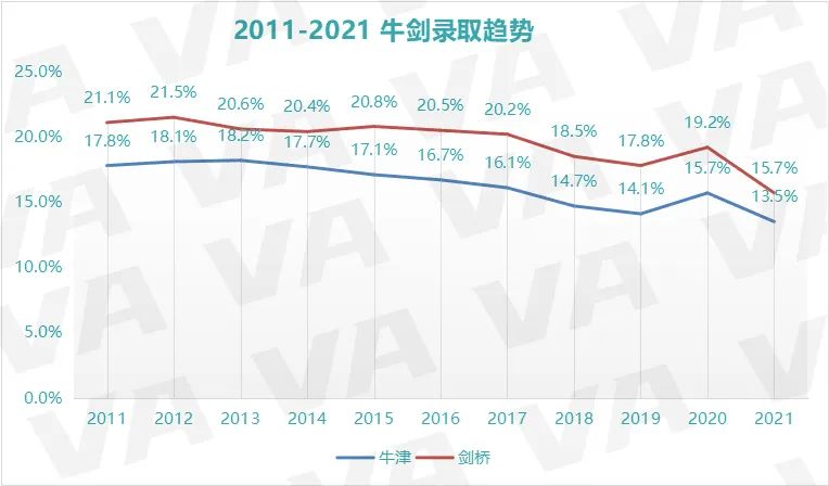 根据牛津、剑桥近年来的申请数据及录取率,会发现牛剑申请也是越来越卷,整体录取率呈下降趋势。