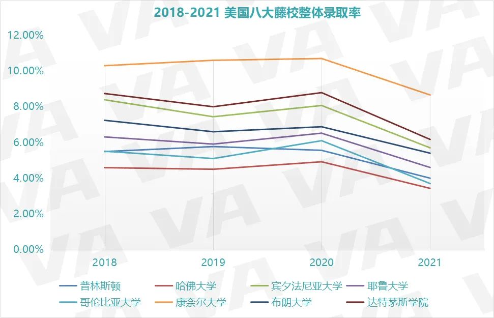 ▲2018-2021 美国藤校录取率统计;数据来自:择校鹿整理