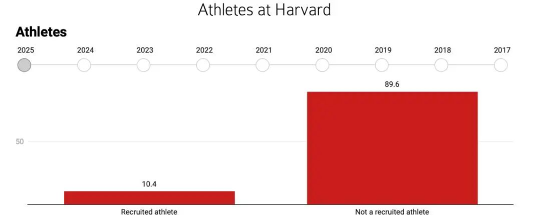 以哈佛为例,根据哈佛Class of 2025新生数据显示,所有新生中,有10.4%是运动员。且近几年新生中体育生占比都在10%-12%左右。