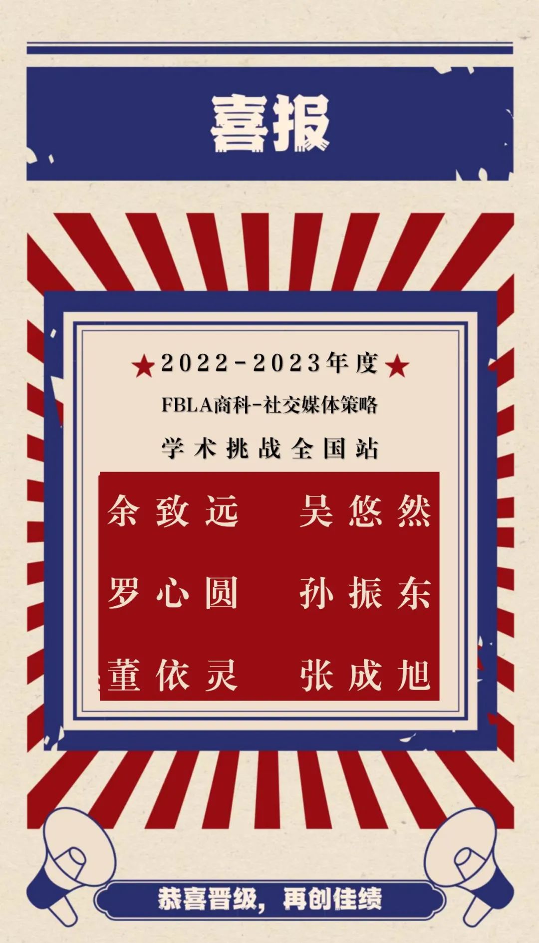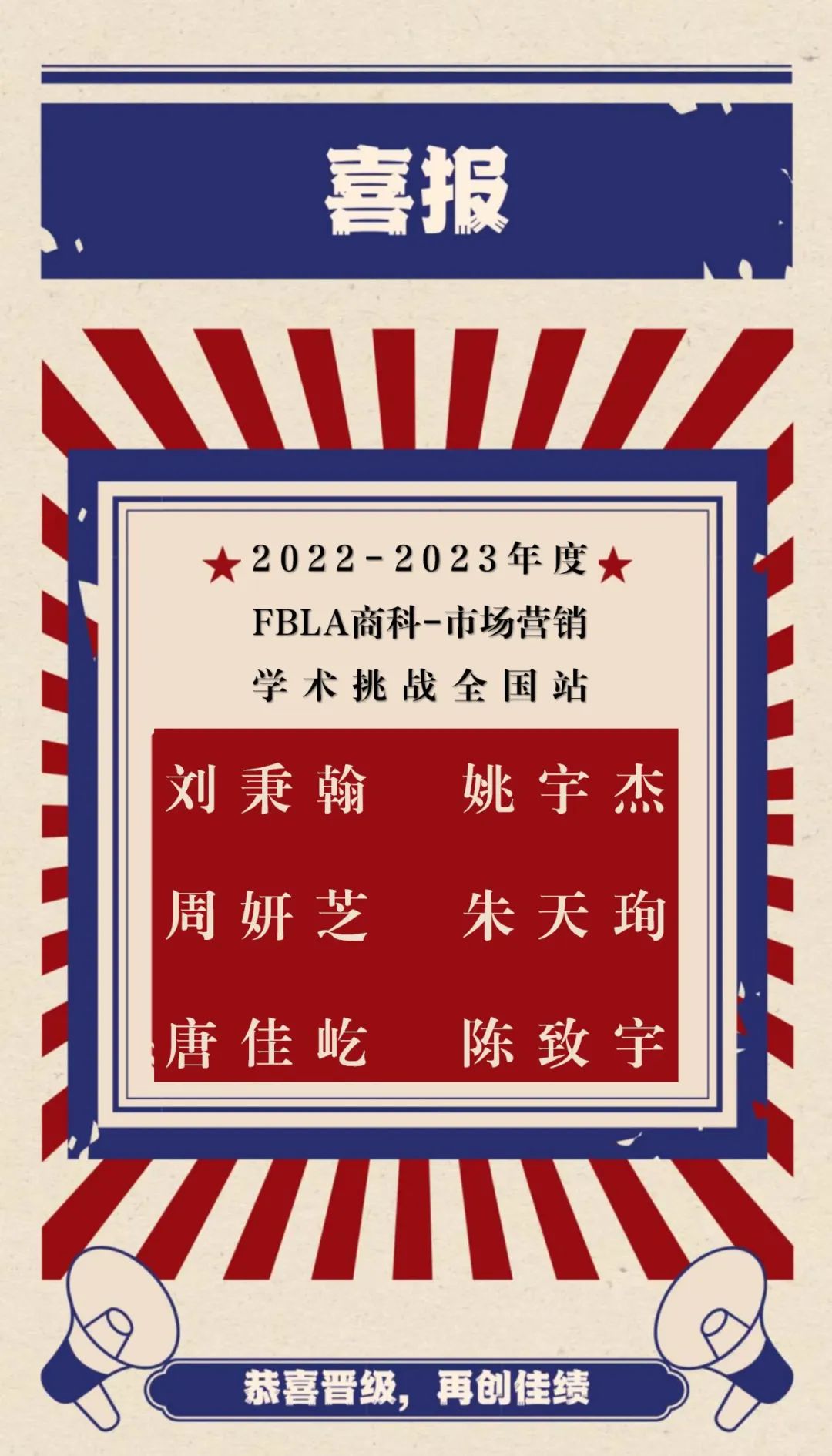 竞赛速递近日,在2022-2023年度FBLA北美高中生学科竞赛中,AP中心学子表现优异,多人成功晋级全国赛。祝贺江苏省苏州实验中学AP中心学生晋级FBLA北美高中生商业竞赛全国站,也祝愿他们在全国赛中再创佳绩!