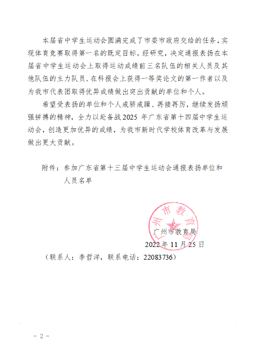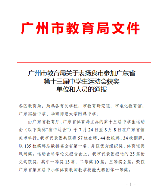 广州市教育局表彰了我校在本次比赛中表现突出的集体和个人,鼓励我校高水平运动团队继续保持高质量发展势头,继续发扬拼搏精神,继续提升运动水平,继续争取资格参加2025年广东省第十四届中学生运动会,创造更加优异的成绩!
