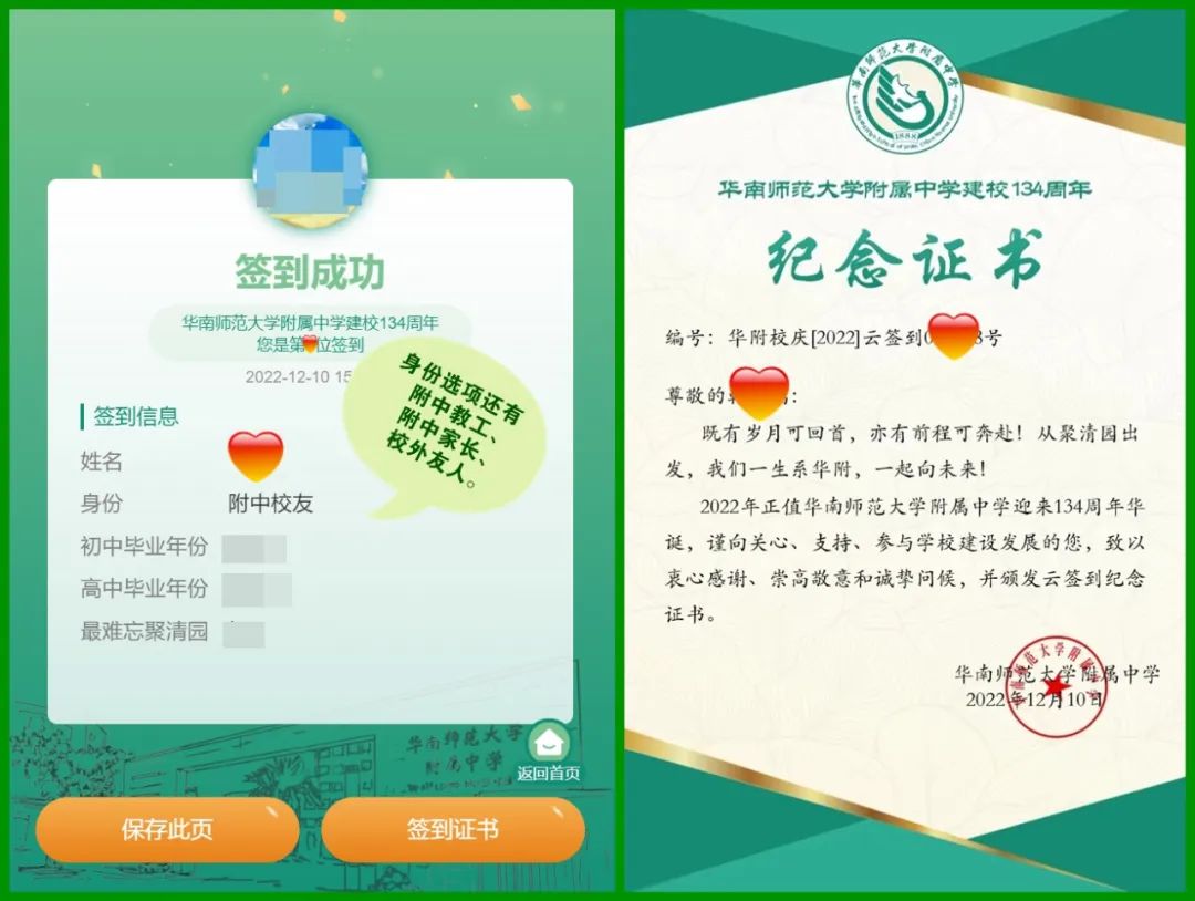 签到人填写相关信息后自动生成“签到纪念证书”,可下载保存并分享至朋友圈。签到身份可选:校友、教工、家长、校外友人
