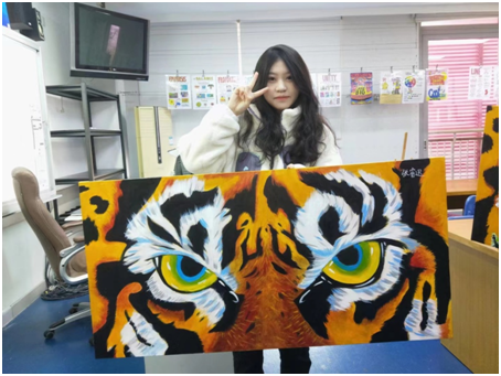 10年级学生Lucy展示她的大型丙烯画《虎眼》