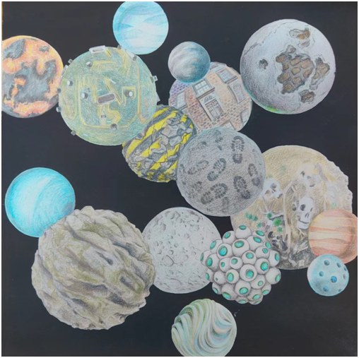 Grade 11 student Vera’s example of a ‘Texture Balls’ drawing using colour pencils and black ink.
