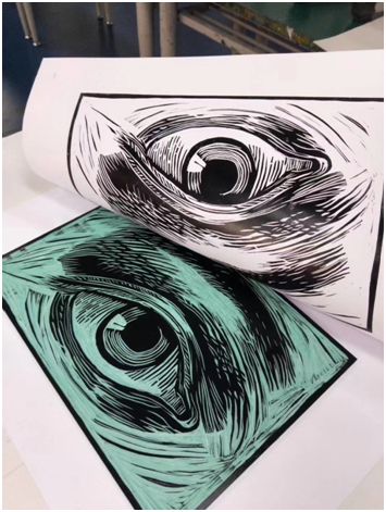 我校的艺术选修课上,学生通过素描、绘画、版画、拼贴和混合绘画等,自己动手实践学习艺术。浮雕版画( linocut)需要在老师仔细的演示和监督下教授,以便学生能正确、安全地使用切割刀。Denvah老师向学生介绍浮雕版画的基础知识,学生们在此基础上制作了一系列原创版画。