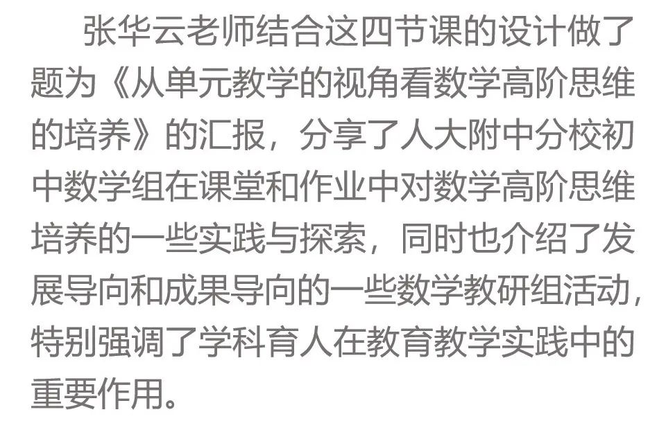 此次活动共分成了两个环节,第一个环节是课堂观摩;第二个环节是教研组工作报告。人大附中分校初中数学组4位老师提供了4节高质量的观摩课;人大附中分校初中数学教研组长围绕教研组建设,做了主题为《从单元教学的视角看数学高阶思维的培养》的汇报。