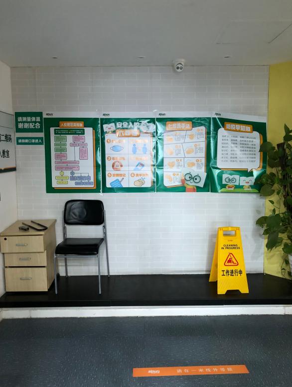 工作人员表示,目前教室撤掉部分桌椅,保证座位间隔不少于一米,并单独设立隔离室,公共区域贴好“一米线”。正式复课前,会通知家长填报体温,同时申报14天内行程,排查是否去过中高风险地区,“复课以后,学员进入校区前要先扫码、测温、登记,家长不能再像过去一样到教室去旁听,需要在门口止步,毕竟安全是第一位的。”