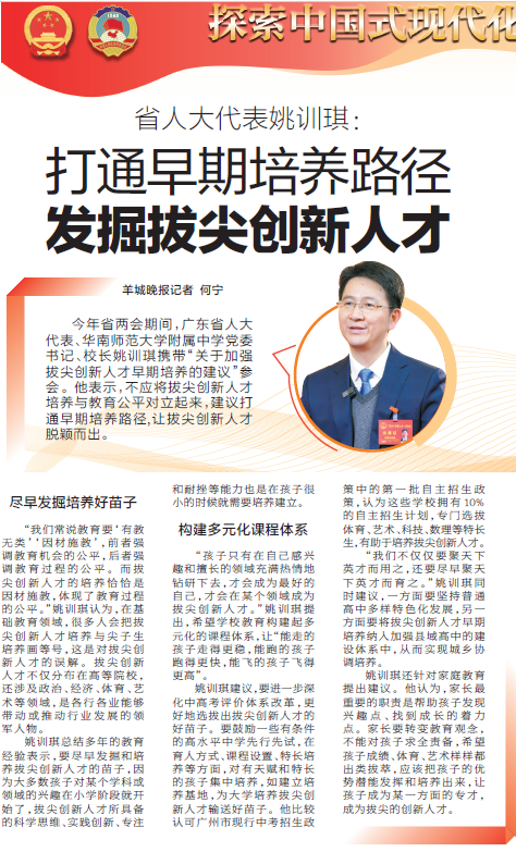 今年省两会期间,广东省人大代表、华南师范大学附属中学党委书记、校长姚训琪携带“关于加强拔尖创新人才早期培养的建议”参会。他表示,不应将拔尖创新人才培养与教育公平对立起来,建议打通早期培养路径,让拔尖创新人才脱颖而出。