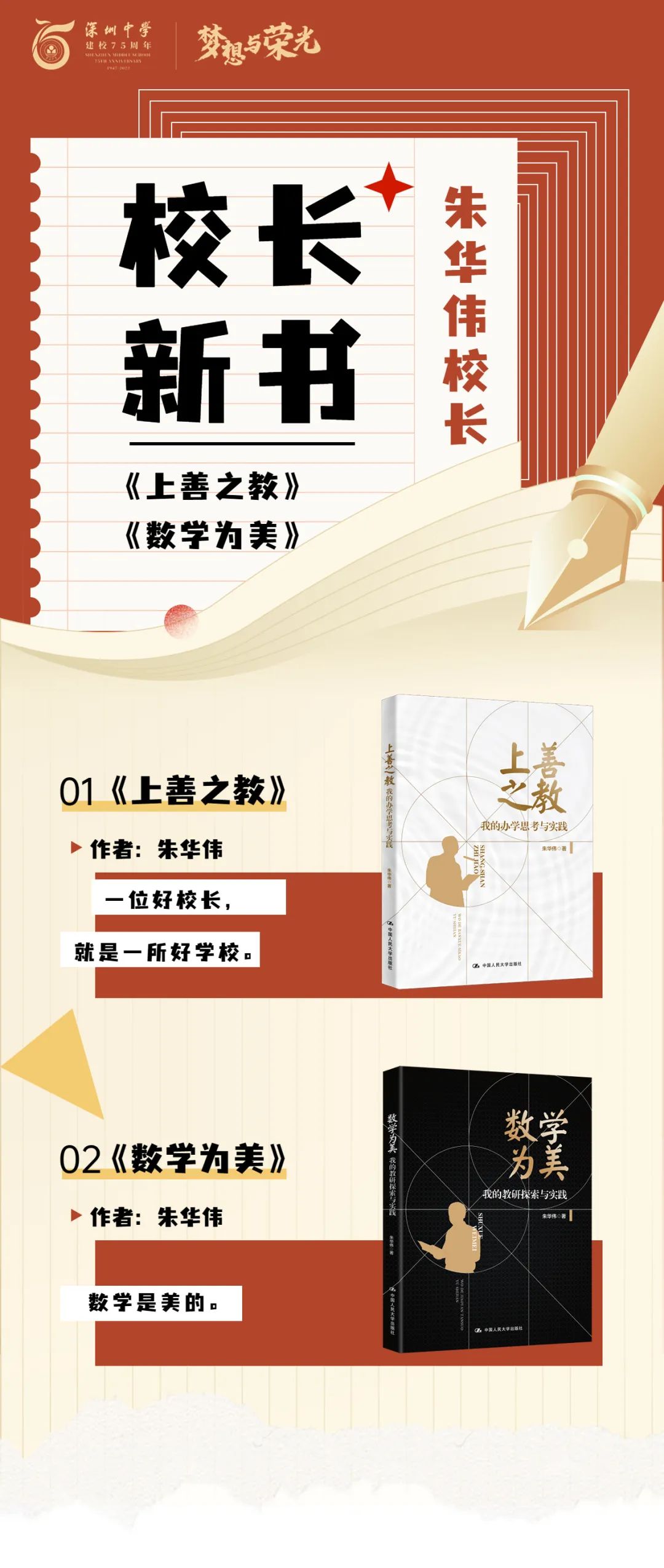 2021年5月,覃伟中市长在视察深圳中学时,鼓励朱华伟校长将其对教育、科研的实践与思考整理出来,以为镜鉴。在大家的勉励和期待下,朱校长在忙碌工作之余笔耕不辍、涓滴成河,最终完成了《上善之教》《数学为美》这两本厚厚的著作。