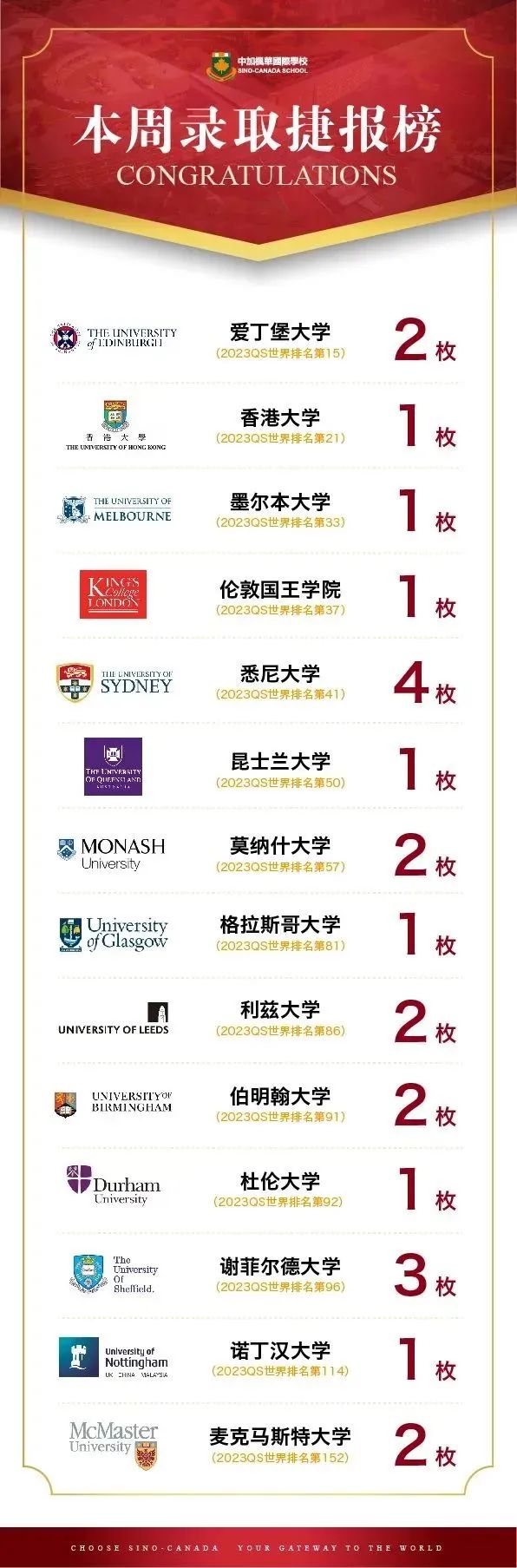 伴随着新春的脚步,中加枫华国际学校再传捷报,本周共收到24枚offer,其中2023QS世界排名第15的爱丁堡大学offer2枚;2023QS世界排名第21的香港大学offer1枚;世界排名Top50名校offer10枚,占比42%, 如墨尔本大学、伦敦国王学院、悉尼大学、昆士兰大学等;世界排名Top100名校offer21枚,占比88%,如莫纳什大学、格拉斯哥大学、利兹大学、伯明翰大学等;专业涵盖会计Accounting、电气工程Electrical Engineering、数字传媒Digital Media、金融数学Financial Mathematics、经济Economics、商科Business、艺术Arts、法学Laws、社会学Sociology 等。