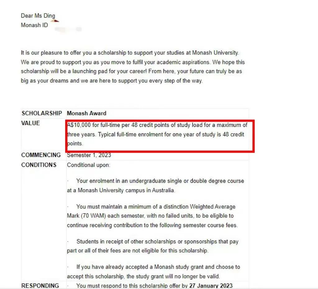 丁弋宸同学获得蒙纳士大学优秀国际生奖学金:每年一万澳币,最高可发放三年,总计三万澳币,折合约15万人民币!