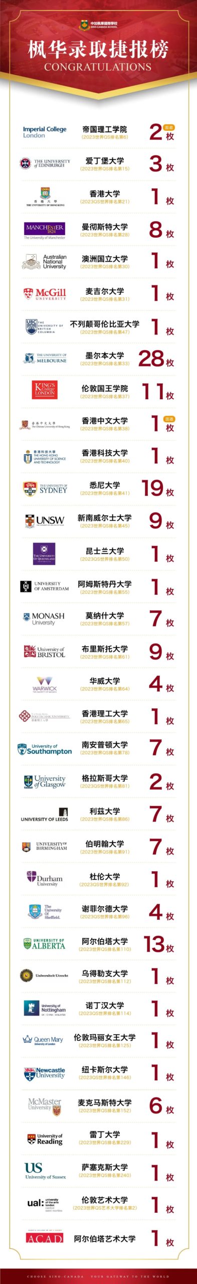 截止2月初,中加枫华高三毕业生共收到162枚offer,其中2023QS世界排名第6的帝国理工学院面邀2枚,2023QS世界排名第15的爱丁堡大学offer3枚,2023QS世界排名第21的香港大学offer1枚;