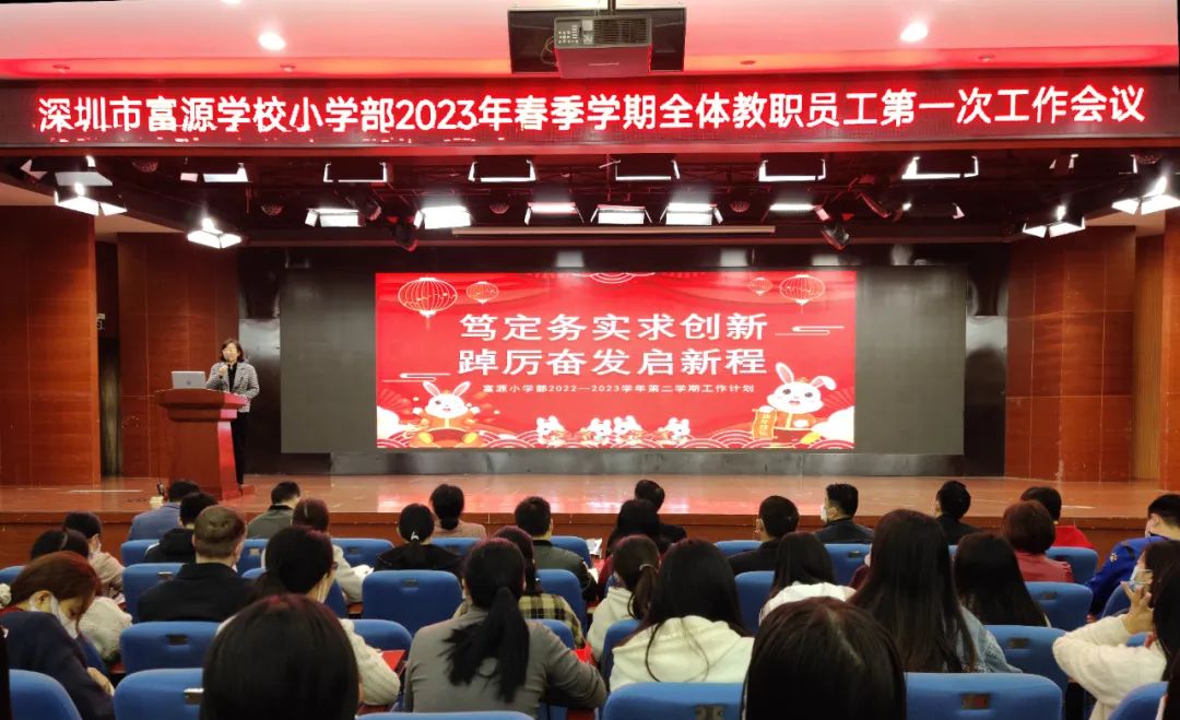 新学期如约而至,新征程起航在即。2023年2月4日上午8:30,深圳市富源学校小学部召开新学期全体教职工大会。我校副校长兼小学部主任柳清、小学部执行主任张金波、小学部全体行政、教职工出席会议。本次大会由小学部A校区教学处熊永魁主任主持。
