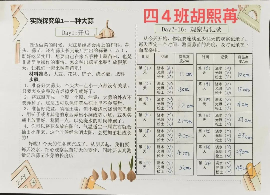 种下一颗颗大蒜,松土、浇水、晒太阳,每天为蒜苗“量身高”,这份作业里不只有数学知识,还有细心、爱心。