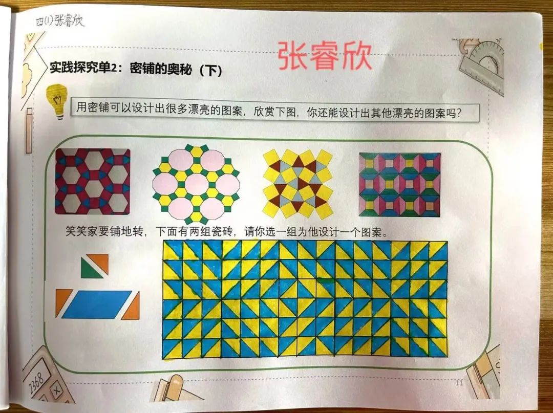 探索“密铺”的奥秘,化身设计师,在纸上为小朋友家设计地砖图案:
