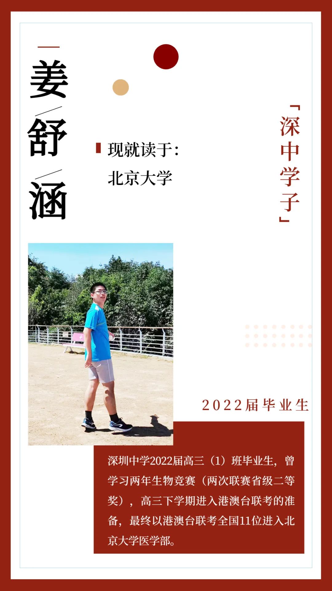 深圳中学学生姜舒涵,高三生活可以说是极为“充实”,作为最早回归班级的竞赛生,他一路走来实属不易。在对高考知识点查漏补缺的同时,他还需要双线备战港澳台联考(科目、内容和分数分配与普通高考有较大差别),一轮复习后即离校集训。我们保持平均两周一次的通话,他每次都和我分享学习情况,诉说生活趣事。为了保全大局,他果断放弃英语听说考试(20分),足见其勇气和魄力,我也对他充满信心。最终,在普通高考中他同样取得了优异成绩。目标明确,冲劲十足就是对姜舒涵高三一年的最佳总结,带着这些宝贵的人生经历和优秀品质,相信他未来定能更上一层楼!